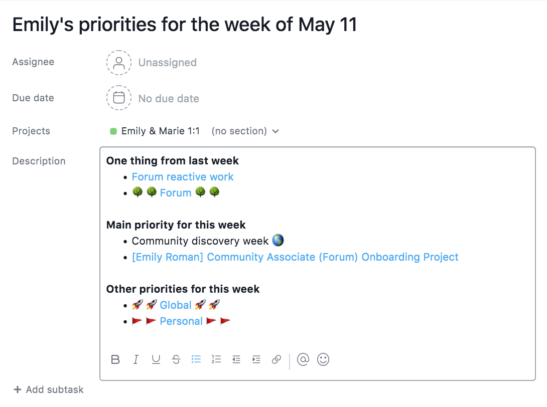 - Adicione tarefas de outro projeto ao projeto de reunião individual para falar sobre elas no contexto adequado. Isso fará com que seu diretor se mantenha atualizado.