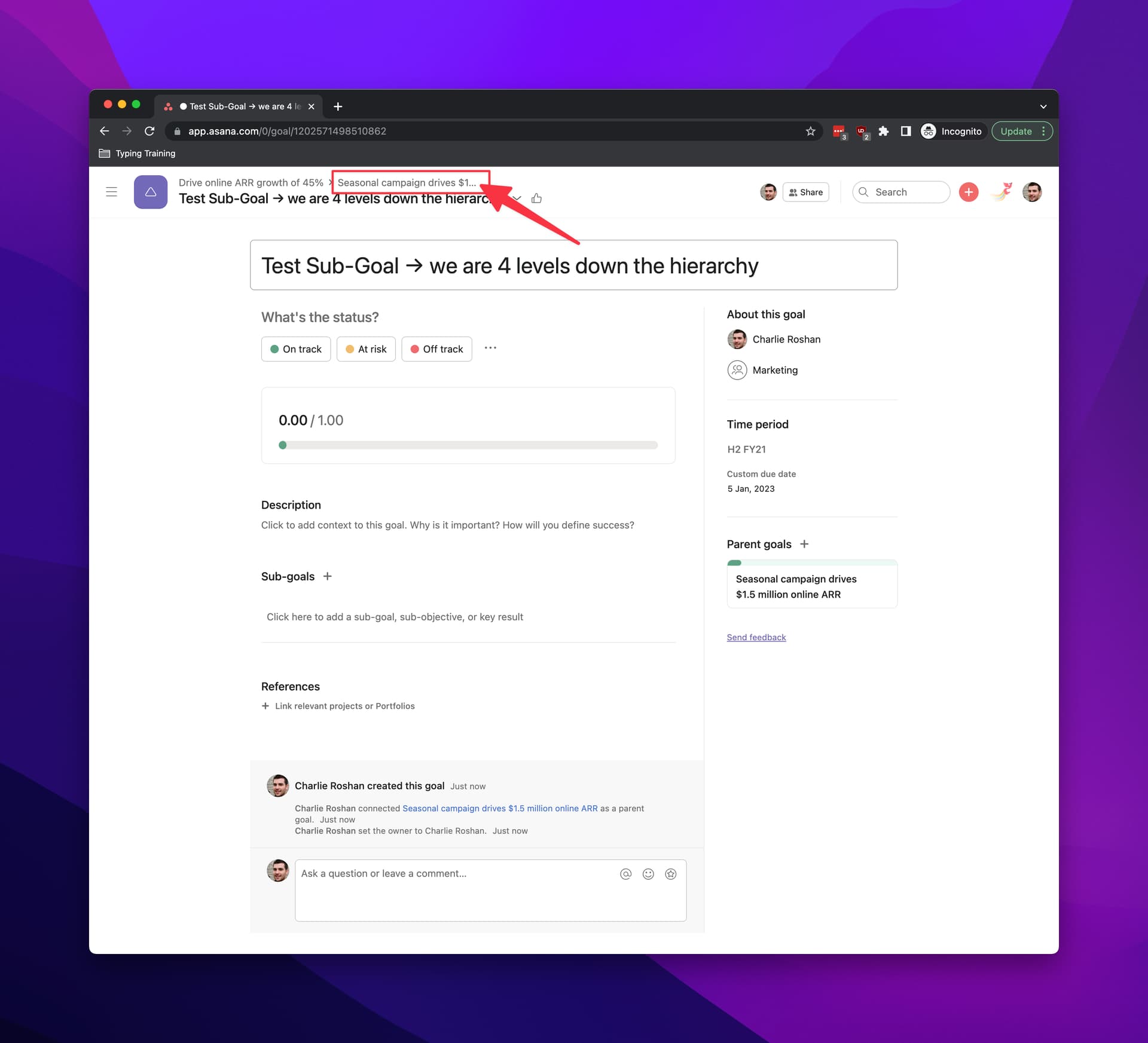 I am all-in with Asana Goals, both professionally and personally. However, when I need to delete a Sub-Goal, unexpectedly, Asana takes me back to the Company Goals Homepage. This means that I have been “thrown out” of the Goal I was working on and am now way back up in the hierarchy of my Goals, sometimes three or four levels up the chain, I am basically starting over…