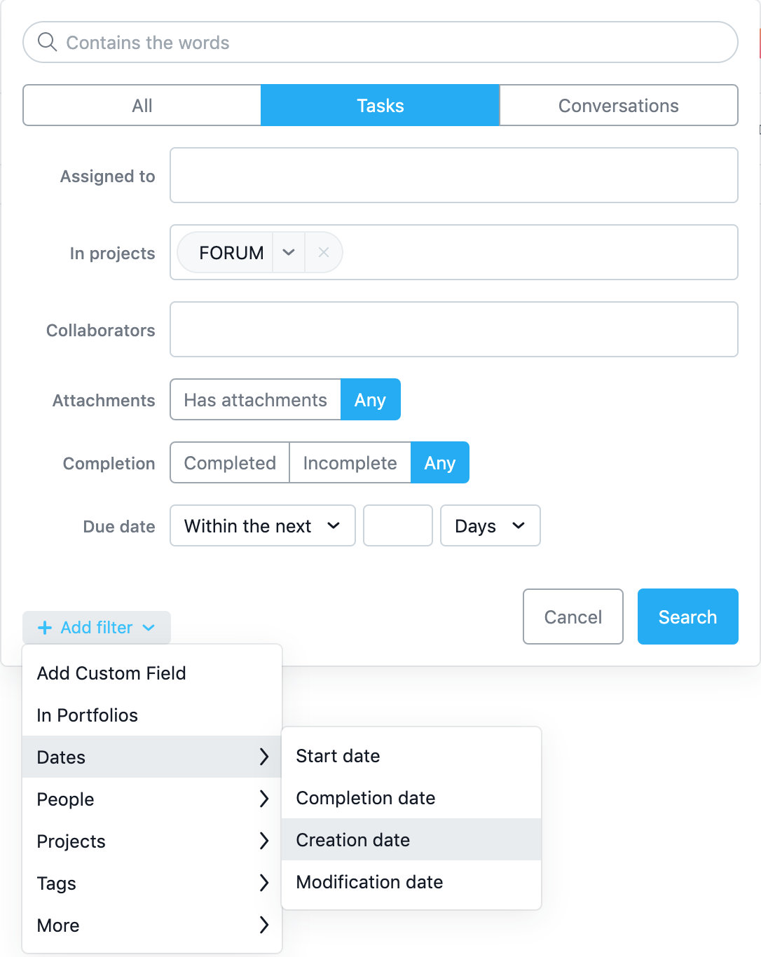 If you are in a Premium Plan, you can run an Advanced Search to look for tasks in a particular Project (or in general) filtered by a specific creation date or created within the last X days. I’m attaching two screenshots illustrating the steps.