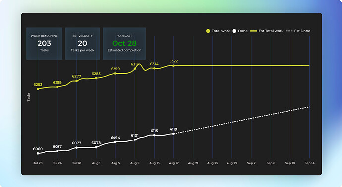 The yellow line shows the total amount of work allocated for the project and the changes made to the scope along the way. The white line is the work done so far. The chart provides an estimated date when the two lines meet.