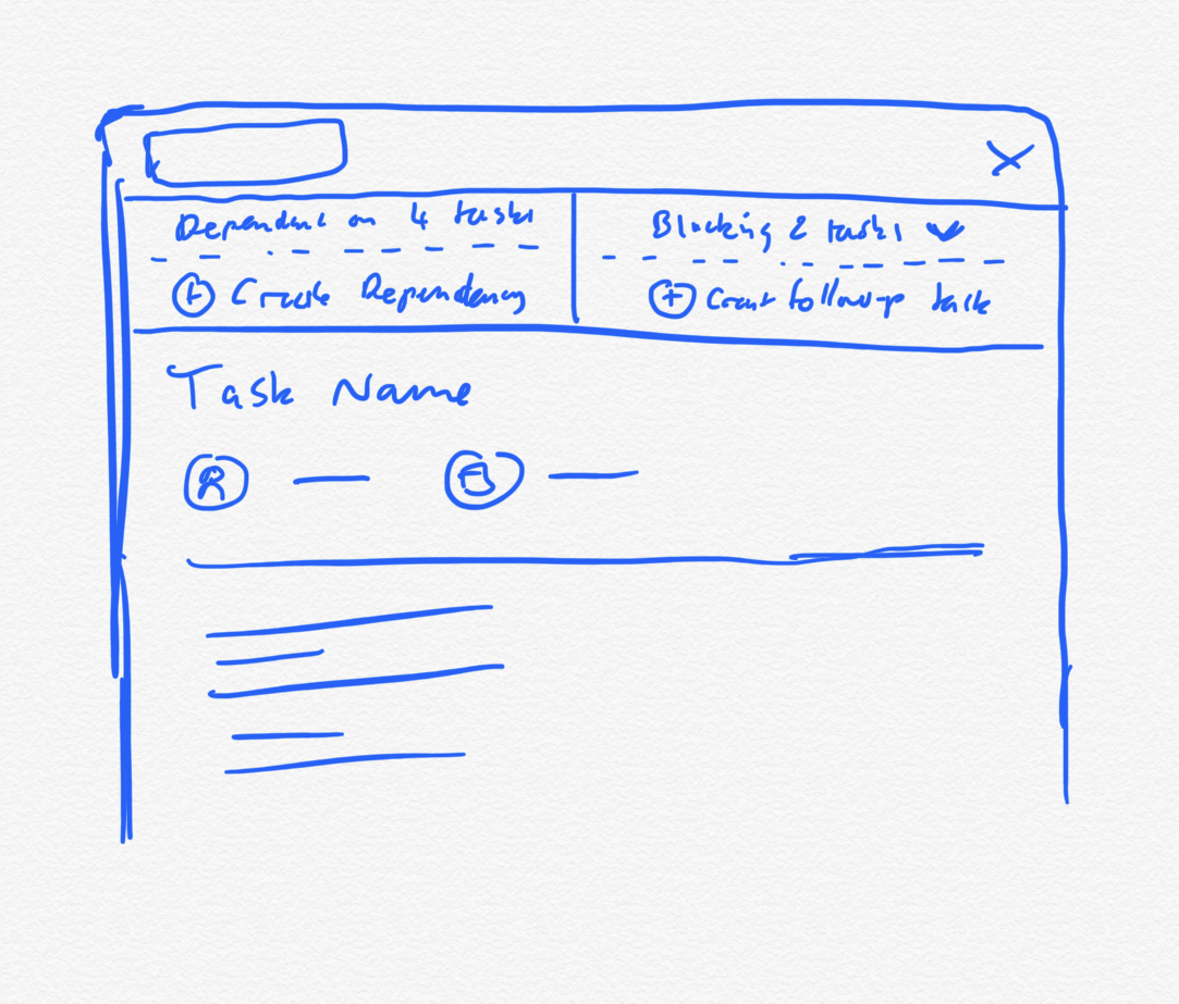 Make it super clear to add new follow-up tasks (maybe an expandable section at the top, alongside the ‘Dependant on…’ strip at the top). Not sure what this one means