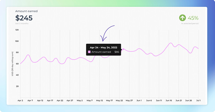 When a currency is selected, the associated currency symbol is shown in front of the numbers. Here’s an example line chart with currency set as “$” to represent the amount in USD. Both the Amount earned on the top left, and the tooltip display the selected currency symbol.