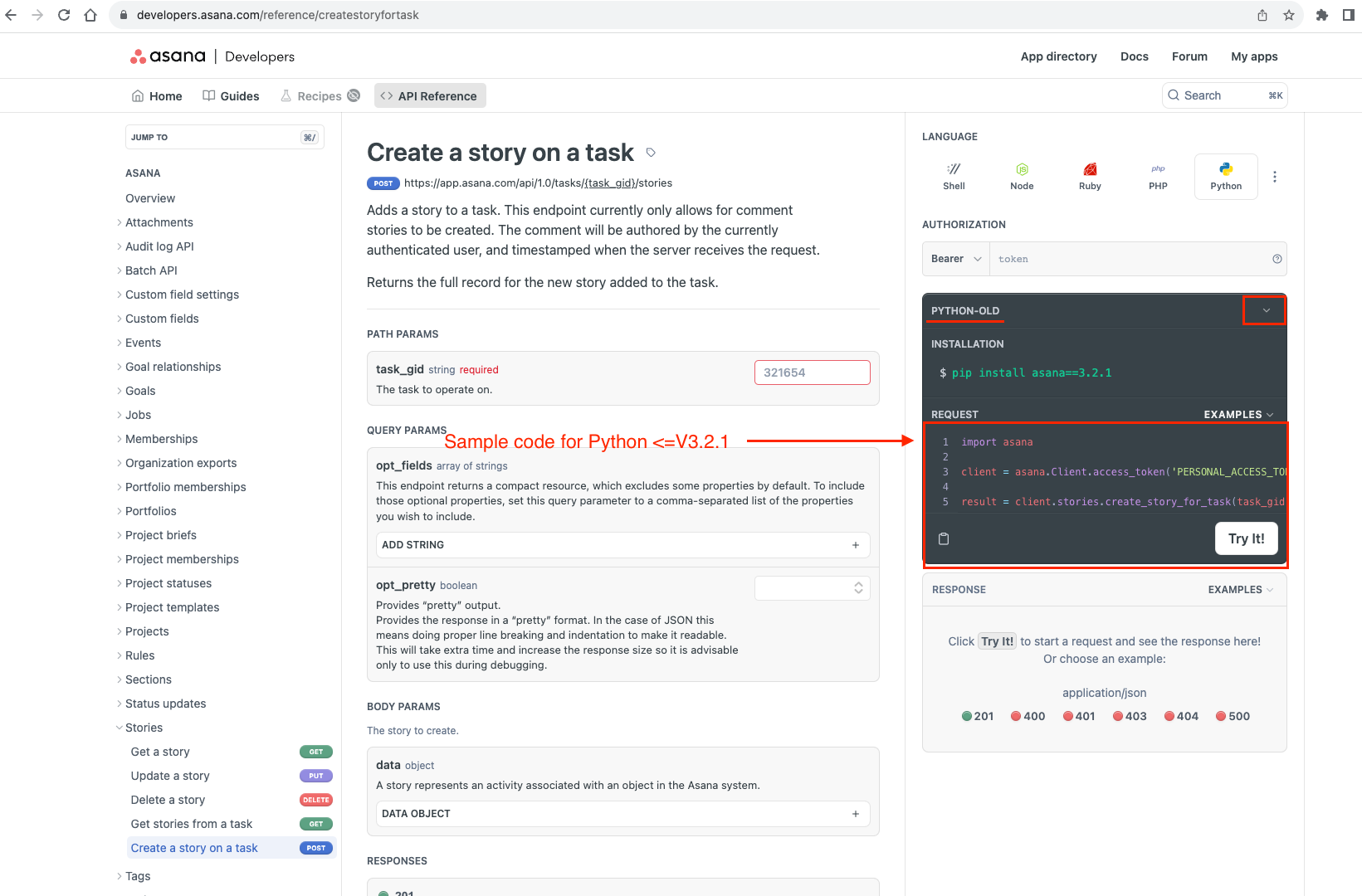 Hi How can I do it in Asana 3.2.1 ? api_response = client.tasks.create_story_for_task(