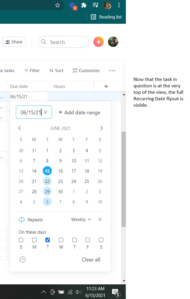 Steps to reproduce: In List View, click the Due Date field. Click the Set to Repeat icon if not already configured to repeat. Unless the task is at the very top of the view layout, the full Recurring Dates flyout window will not be visible (the bottom will be cut off).