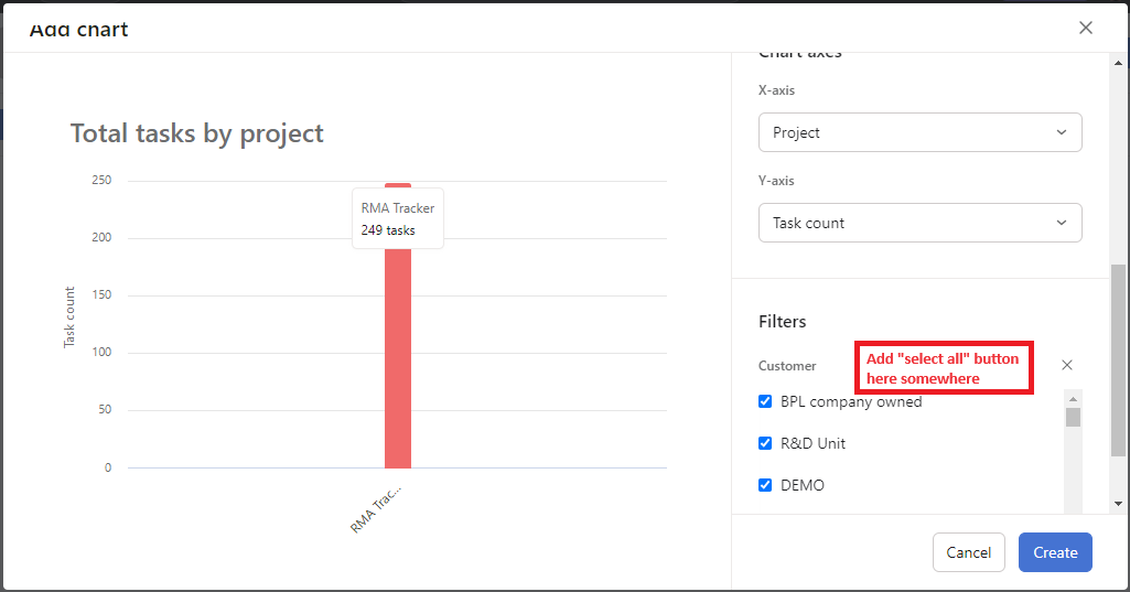 When creating a report, it would be useful if you could “select all” on the different filter options. For example, we have a lot of customers listed in a custom field, and most of the time I want to select all then remove a few, but at the moment it only selects the first 49 and I have to manually select the rest.