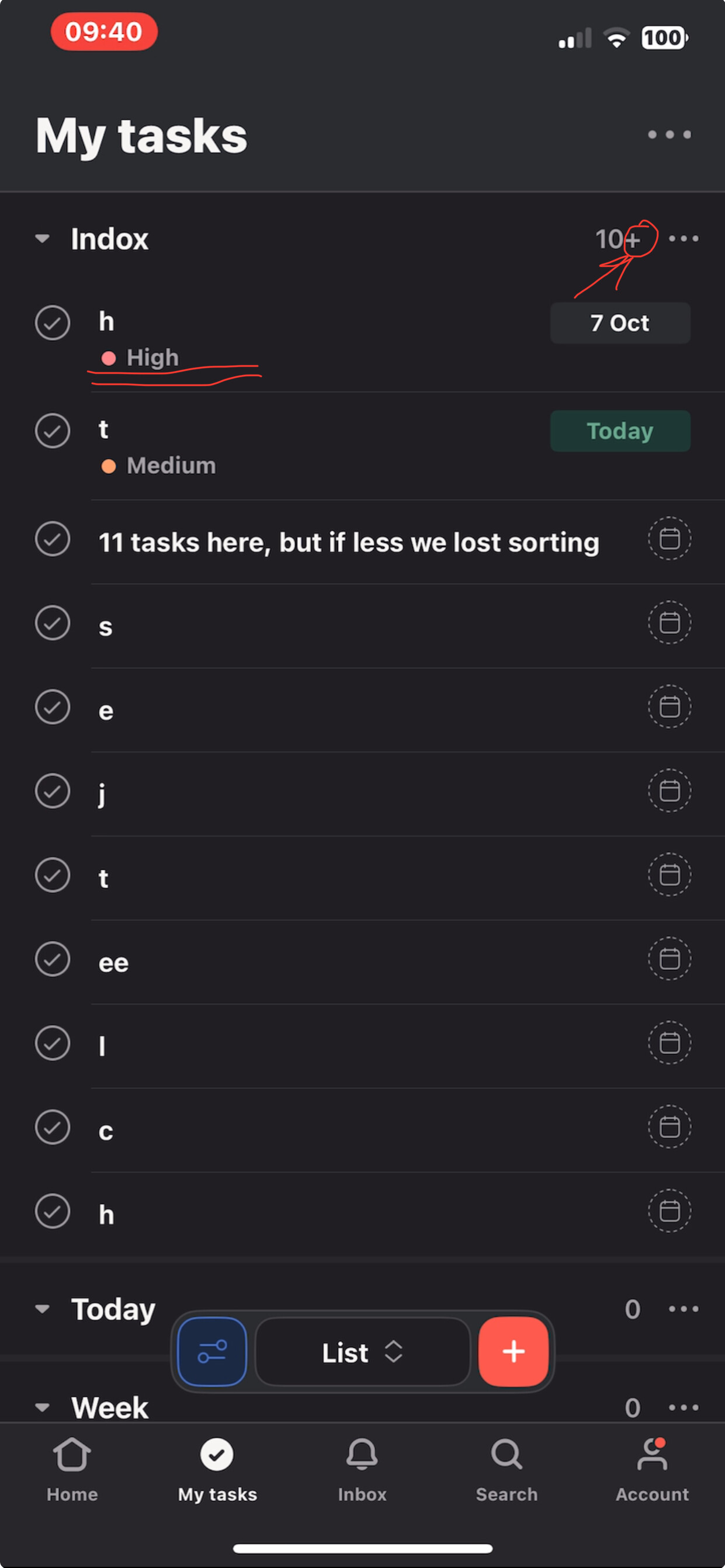 Here is sorting rule: priority field, then due date. Task with high priority in the top of the list. Take a look at “10+”, here is 11 tasks in the section Inbox: