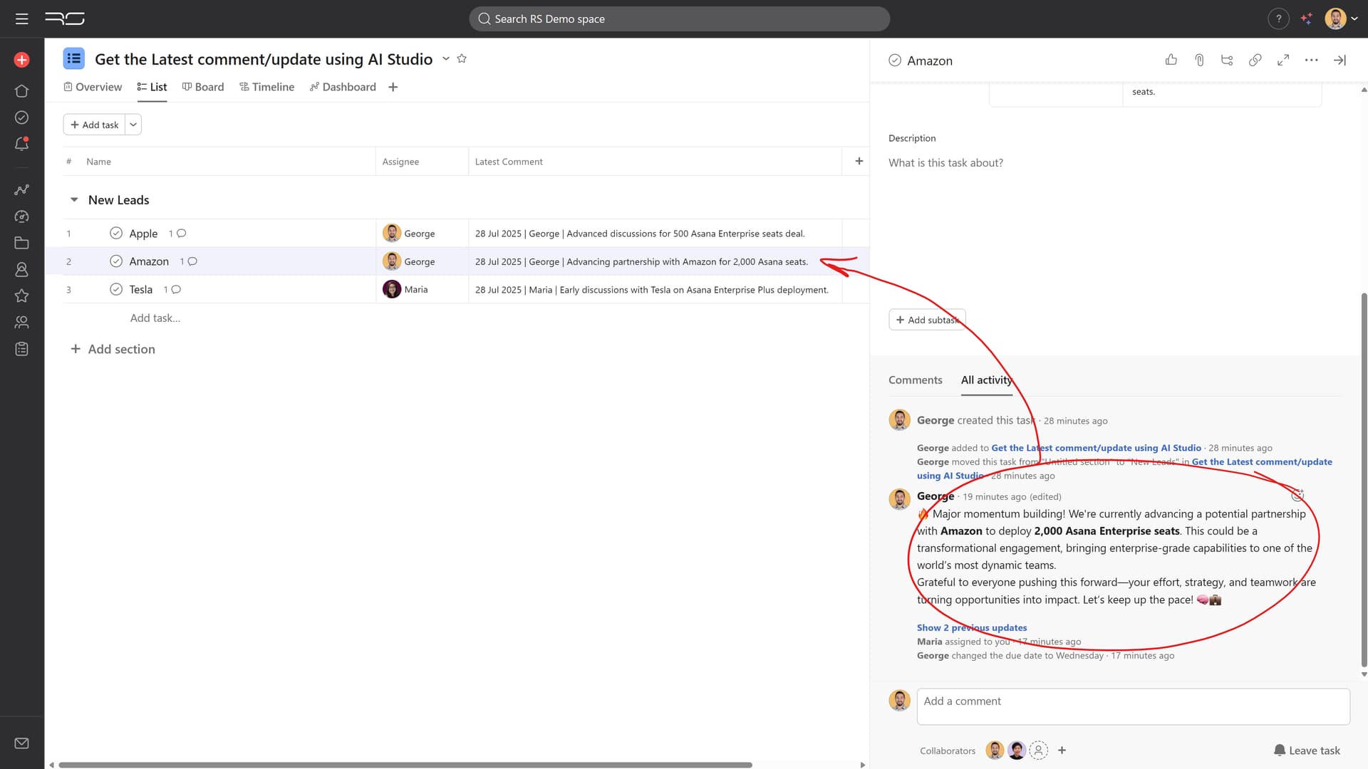Here are some more examples of comments within a task and the resulting summary that is surfaced in the list view, using AI Studio: